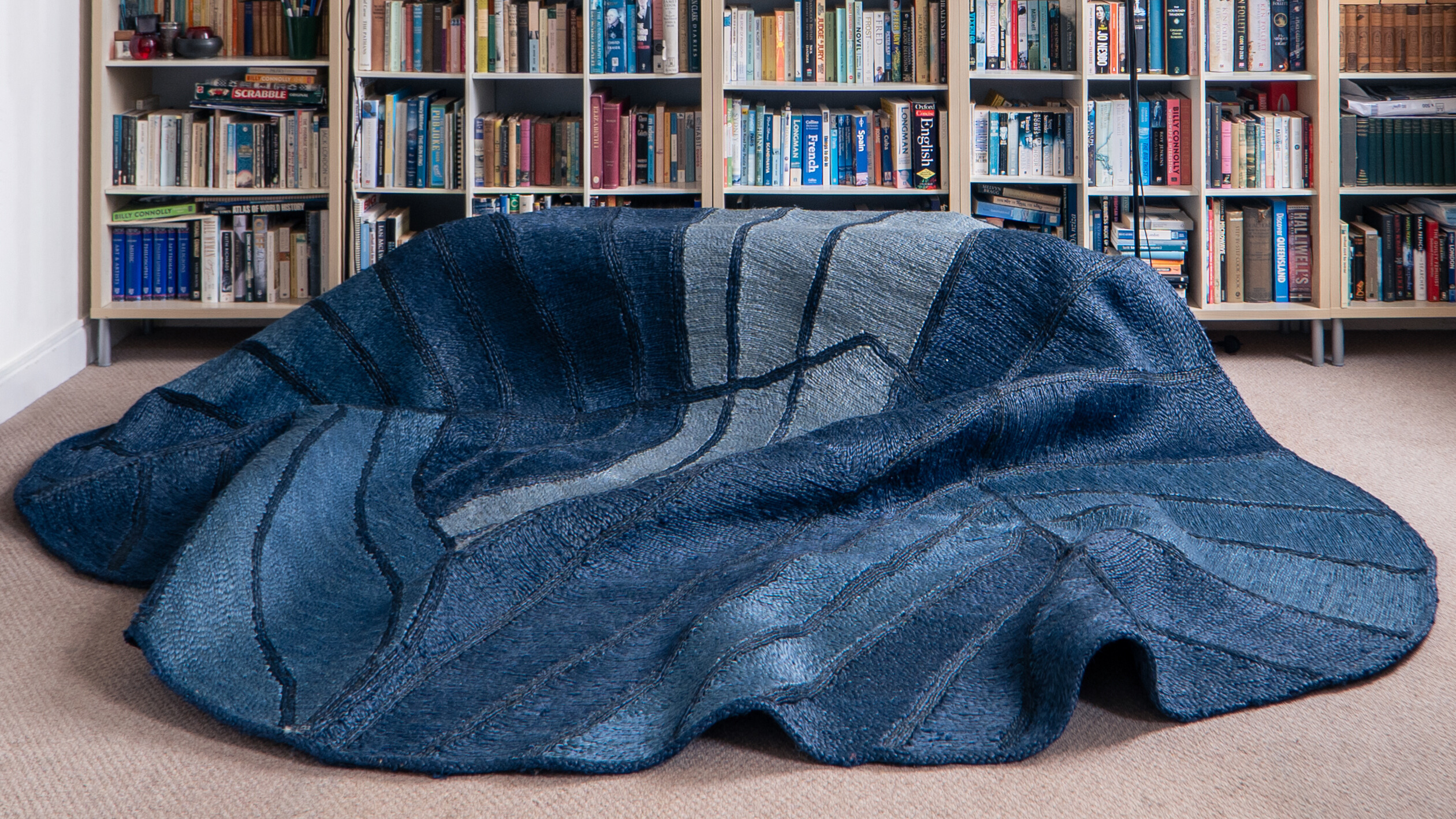 Jiko II . "The Confluence II" . Deep Sea The pattern draws inspiration from the lively waterways of Onitsha, where the Niger and Benue rivers meet along the banks of Eastern Nigeria’s Igboland. The design captures the rhythmic motion of trade boats and the bustling flow of commerce that has shaped the region for generations. Each flowing line tells a story of connection, reflecting the currents that carried goods and ideas through this historic hub. Crafted by hand from 100% jute, chosen for its durability and natural character, it embodies the strength and spirit of these resilient river communities.